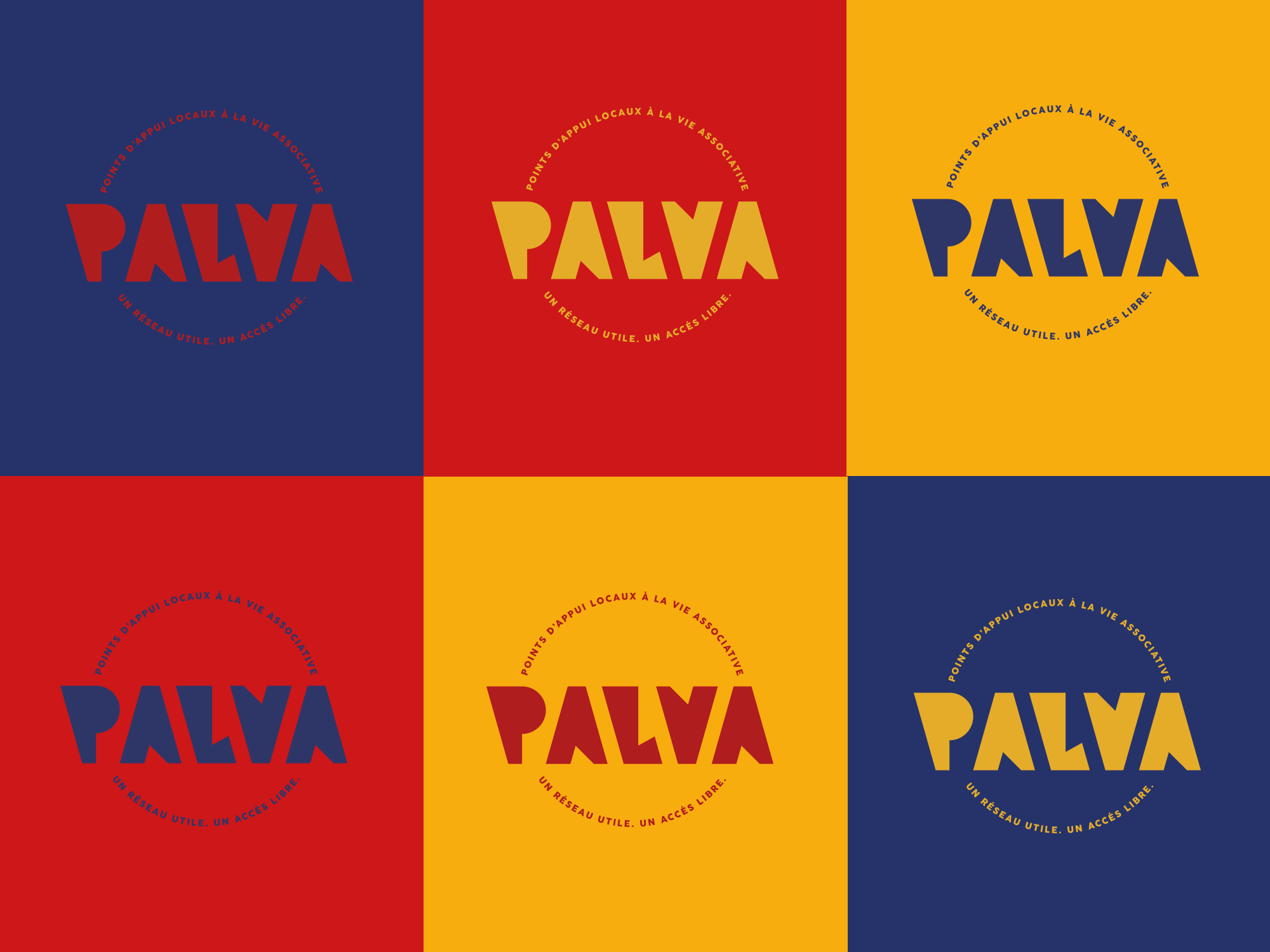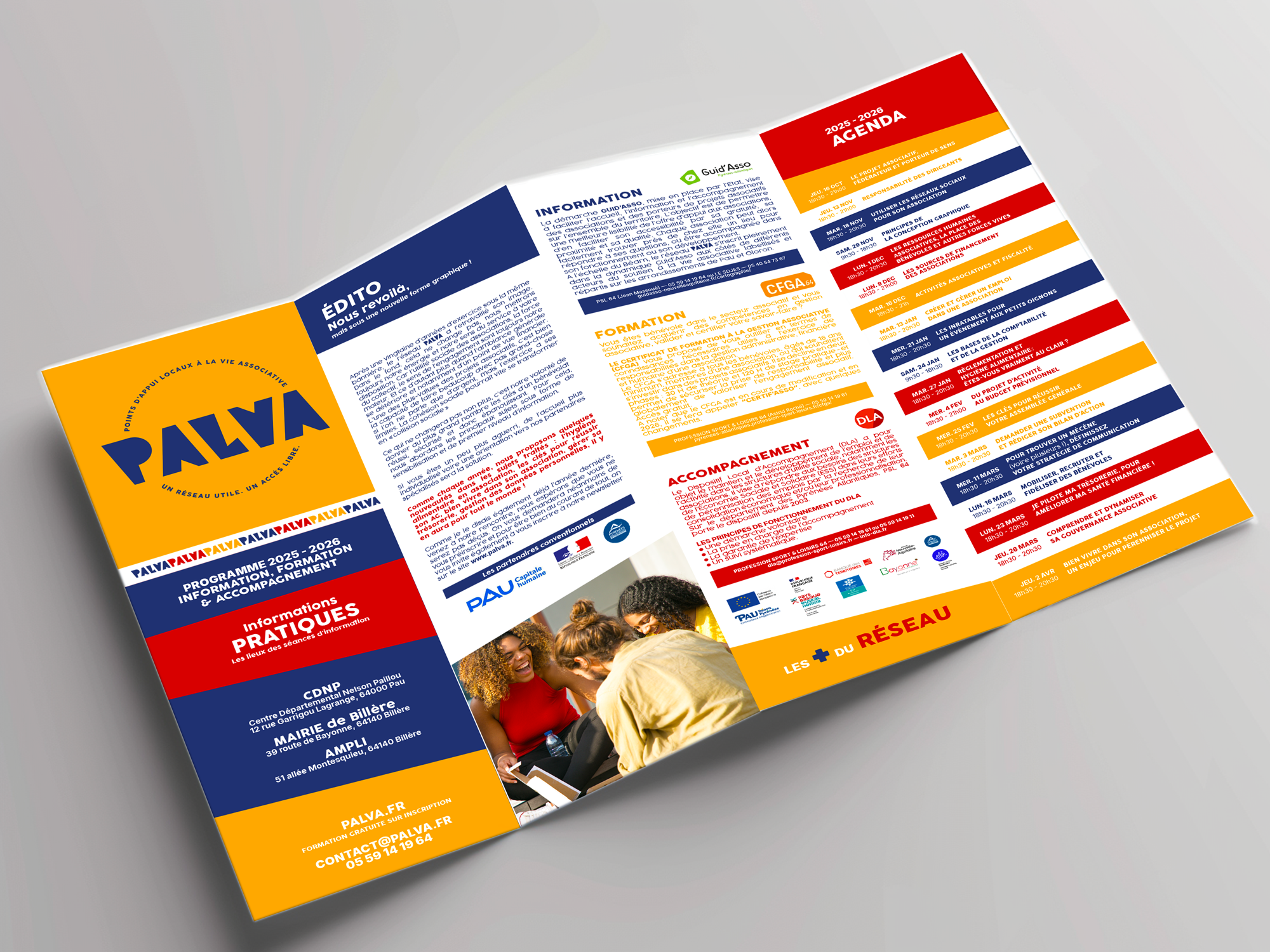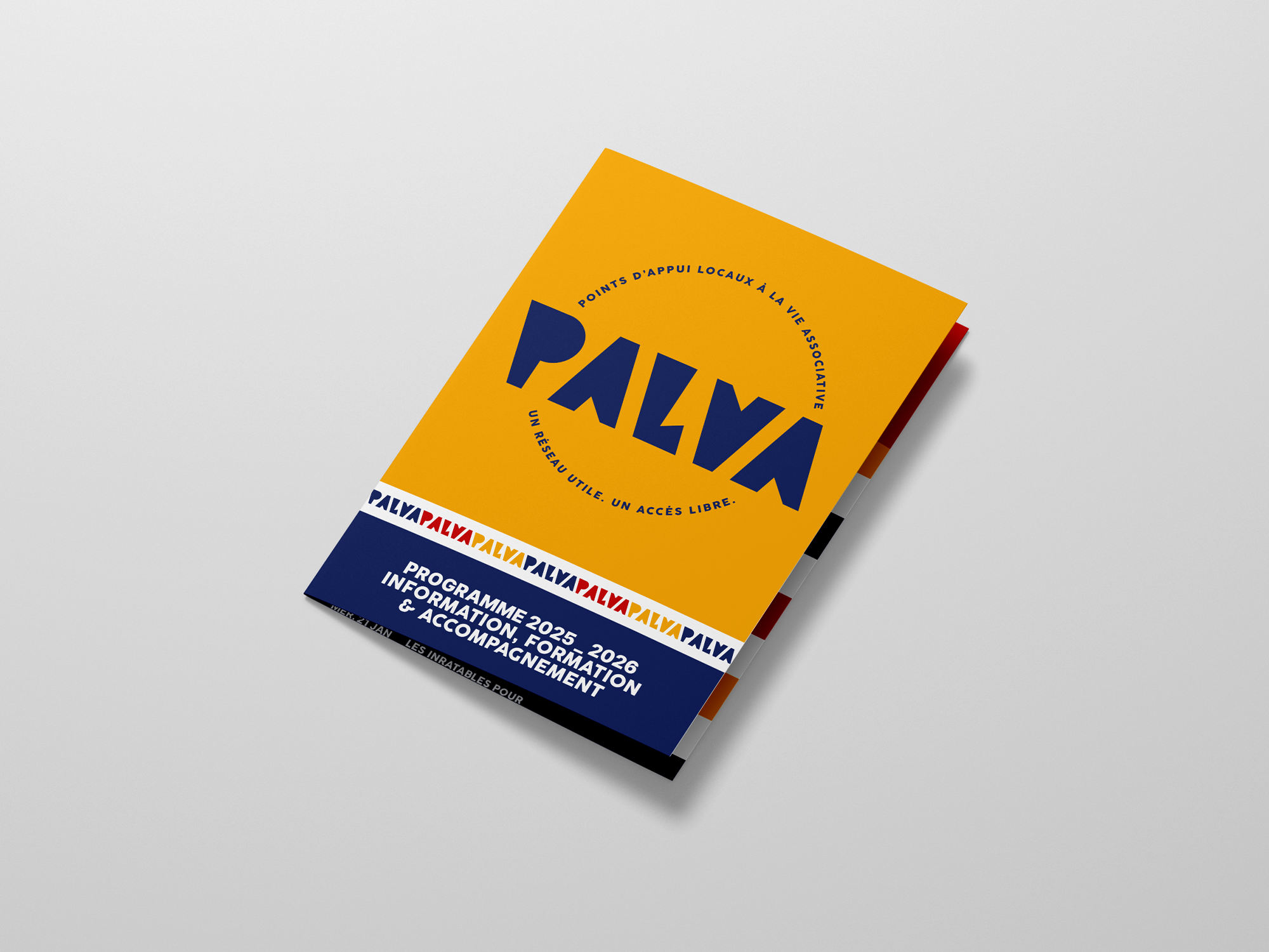 Nous avons repensé le logo et la palette de couleurs pour construire un univers visuel plus vivant, capable de refléter les valeurs de solidarité, de proximité et de coopération qui animent le Réseau PALVA. Cette nouvelle identité a ensuite été déclinée sur un support central, le dépliant annuel présentant les actions et formations proposées. Pensé comme un outil clair, attractif et pratique, il facilite l’information, encourage la mobilisation et valorise les acteurs associatifs du territoire.